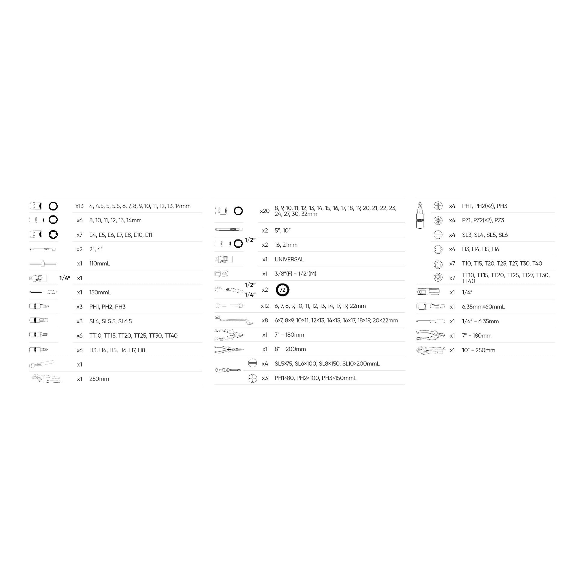 · Chiave esagonale 1/4": 4 mm, 4,5 mm, 5 mm, 5,5 mm, 6 mm, 7 mm, 8 mm, 9 mm, 10 mm, 11 mm, 12 mm, 13 mm, 14 mm