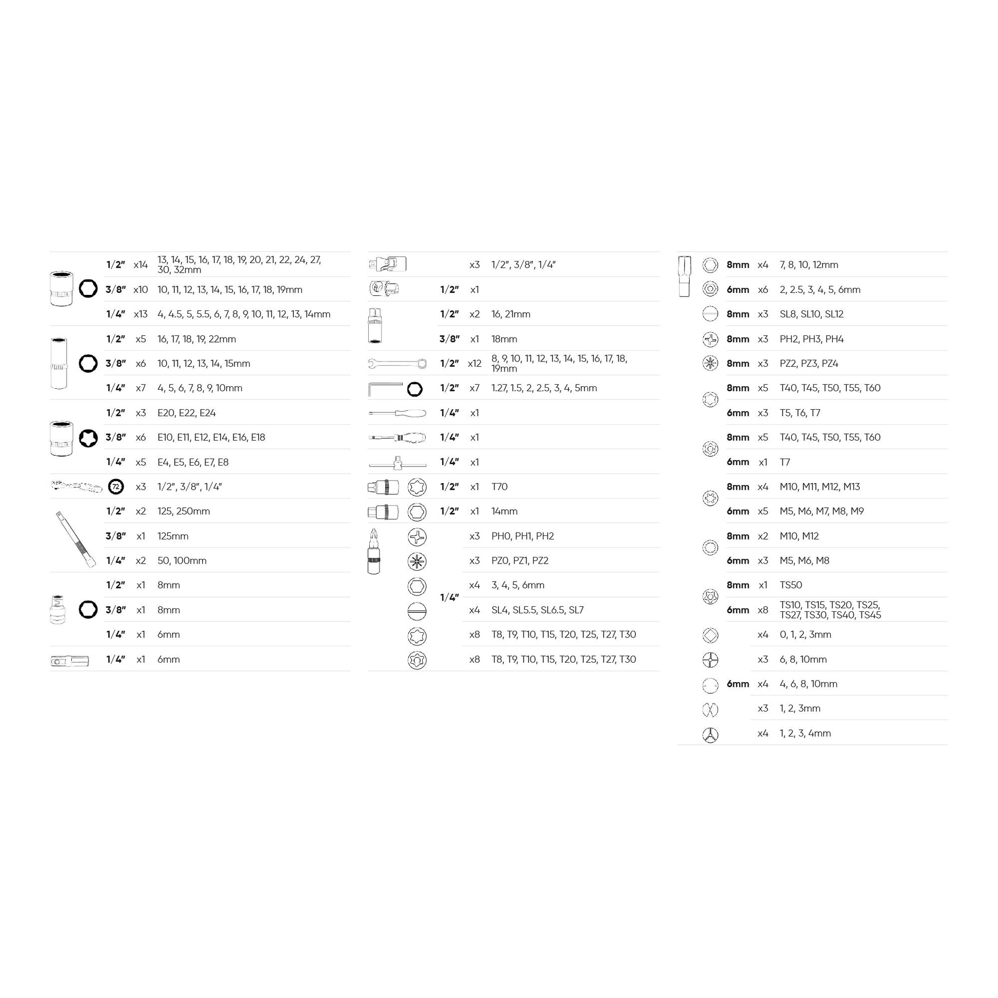 SET DI UTENSILI DA 216 PEZZI CON BUSSOLE ESAGONALI DA 1/4", 3/8" E 1/2" – FINITURA ZINCATA